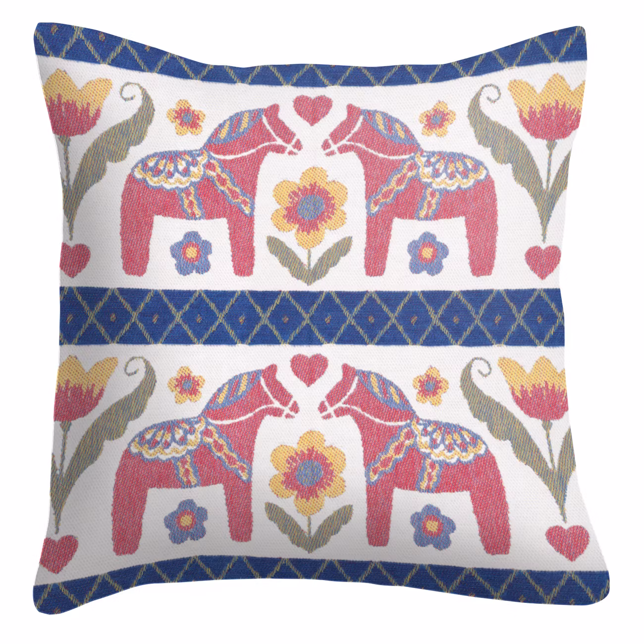 Mjukt och fluffigt kuddfodral med röda hästar och blommor i allmogestil